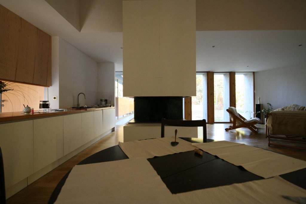 Facing the road, the pavillion has a series of slit windows which filter the light and afford privacy, animating the living area which is partially separated from the kitchen by the fireplace.