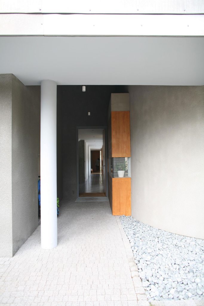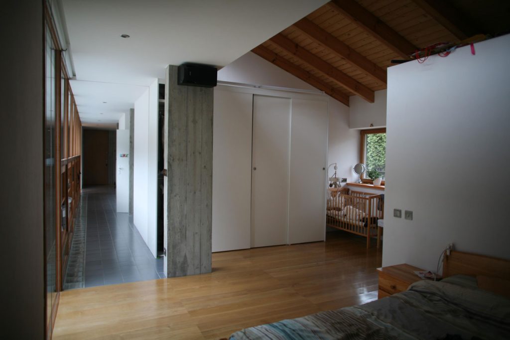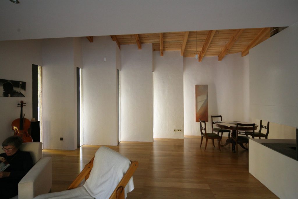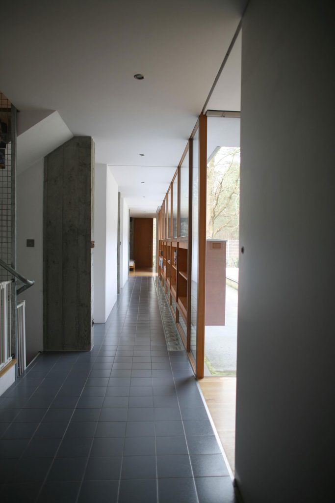 The entry piece, off the road, passes the main living pavilion continuing on to the bedroom area. A later decision was the addition of a floor above which could become a small autonomous apartment.