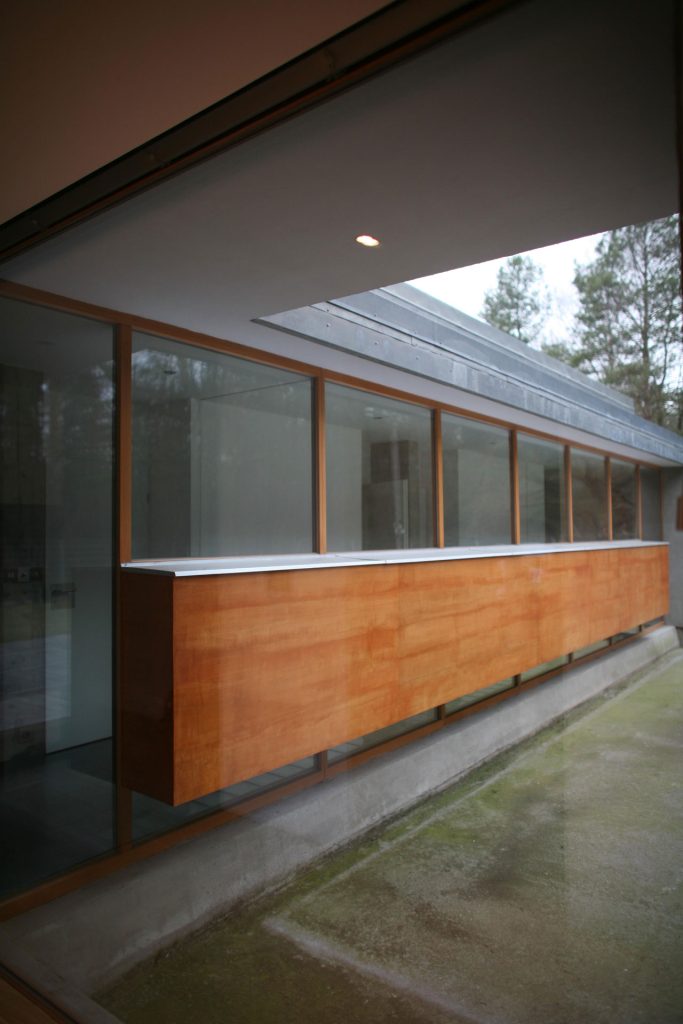 A simple solution evolved, an L with the service area backing closely onto the adjacent property. This long side of the L has small windows on the back with full length strip windows towards the woods.