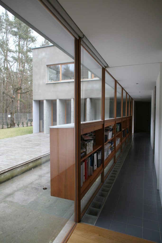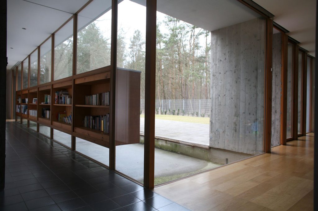 The view through sliding doors is out to the garden with its reflecting pool and the wood.